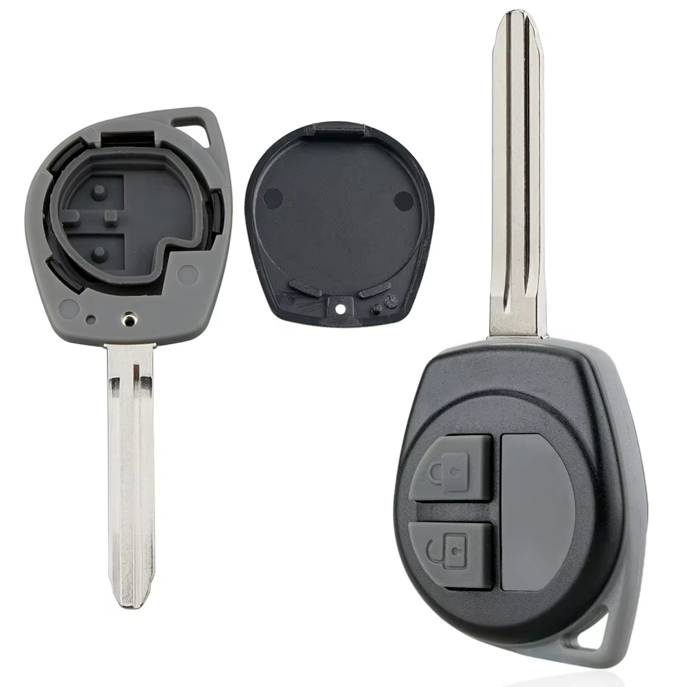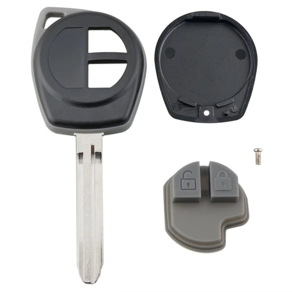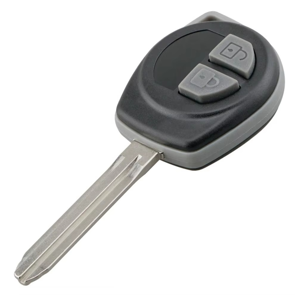 2 gombos Suzuki kulcsház, amely elektronikát nem tartalmaz. A kulcsház nyers kulcstollal és szilikon nyomógombokkal rendelkezik.