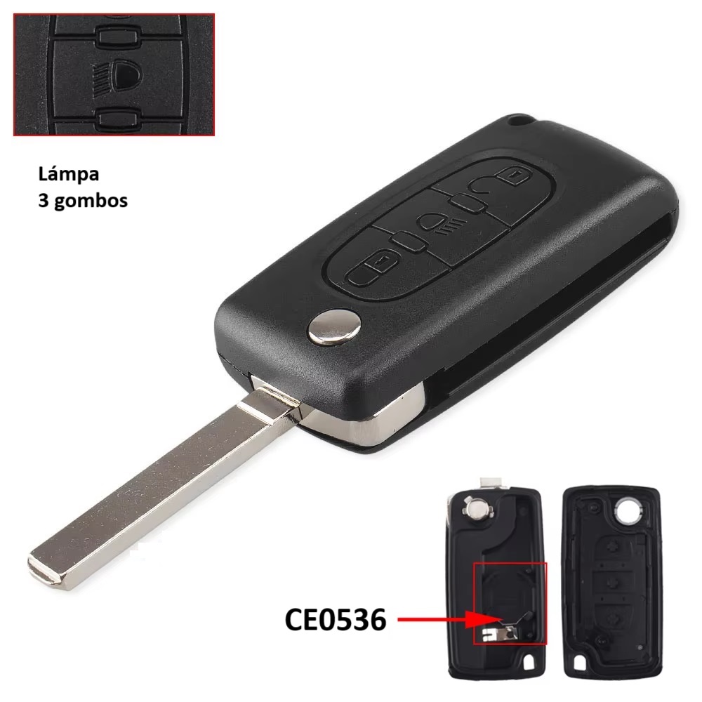 3 gombos Peugeot/Citroen elemtartós bicskakulcsház- CE536- lámpa, amely elektronikát nem tartalmaz. A kulcsház nyers kulcstollal rendelkezik.